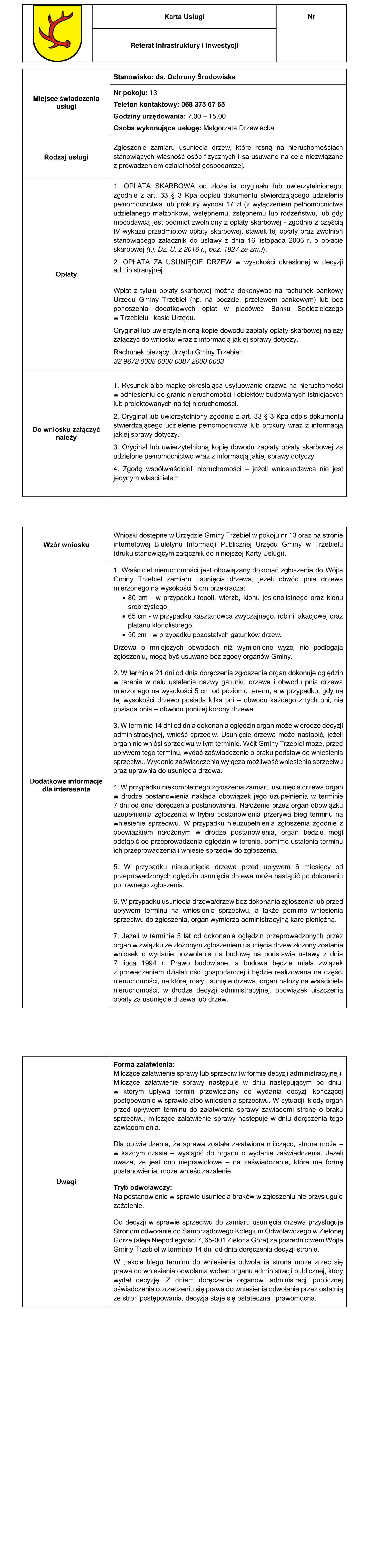 Pobierz dane XML Zgłoszenie zamiaru usunięcia drzew, które rosną na nieruchomościach stanowiących własność osób fizycznych i są usuwane na cele niezwiązane z prowadzeniem działalności gospodarczej Drukuj informację Zgłoszenie zamiaru usunięcia drzew, które rosną na nieruchomościach stanowiących własność osób fizycznych i są usuwane na cele niezwiązane z prowadzeniem działalności gospodarczej